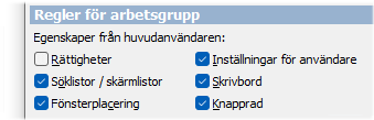 Övriga tre arbetsgrupper innehåller valda specifika egenskaper för gruppen, t.ex. inställningar (för kassa) med avseende på gruppen Säljare.