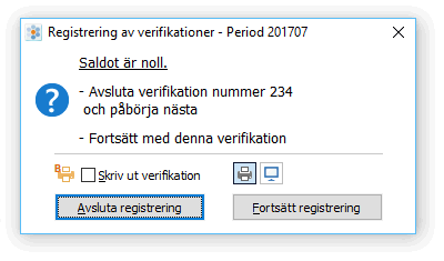 Vid t.ex. registrering av verifikationer eller konteringar i kundreskontra eller leverantörsreskontra visas dialogen Saldot är noll. Dialogen visas när kolumnerna debet och kredit går jämnt upp och erbjuder avslutande eller fortsatt registrering av det aktuella verifikatet eller fakturan.