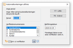 För att utföra automatkonteringar ska period, bokföringsdatum och verifikationsserie anges. En verifikation skapas automatiskt när rutinen utförs baserad på registrerade automatkonteringar.