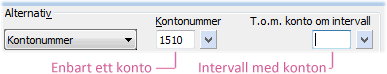 T.o.m. konto om intervall. Ofta anges ett eller flera enstaka konton för att ingå i raden för rapporten. Genom att också ange ett T.o.m. konto, kan ett helt intervall av konton definieras i en och samma position.