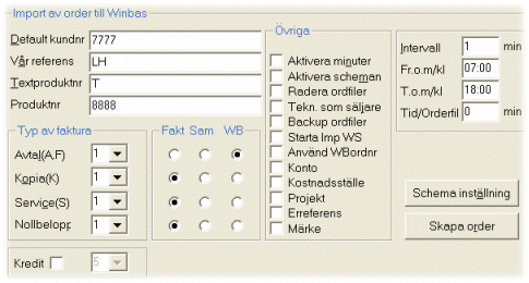 Knappen Schemainställning visar bilden för att göra schemainställningar med avseende på import av order till Winbas.