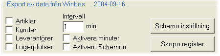Både tidsintervallet och schema-inställningar går mot förändringsdatum. Detta innebär att endast poster som förändrats i något avseende baserat på de 4 registren artiklar, kunder, leverantörer och lagerplatser kommer att läsa ut. Detta innebär givetvis att det i normalfallet alltid är betydligt färre transaktioner som går över till WinServ till skillnad när man kör Skapa register då allt läses över oavsett om posterna har förändrats eller ej.