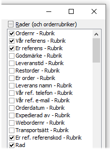 Underrubriker på samlingsfaktura Eftersom en faktura av typen samlingsfaktura kan innehålla flera ingående order, kan varje order innehålla unika uppgifter såsom t.ex. Vår referens eller Er referens. Detta innebär att dessa fält även kan väljas in på radnivå som underrubriker i blankettens design. Fälten från själva ordern på samlingsfakturan heter då t.ex. Er referens Rubrik och utgör en rubrik innan raderna i respektive order på fakturan enligt figuren nedan: |