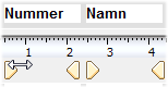 Flytta eller justera fält Bredden på utskriftens fält justeras genom att med musen flytta pilarna som finns under linjalen mitt på skärmen. Text som överskrider den justerade bredden på fältet kommer inte att skrivas ut vid utskrift, utan skrivs fram till den bestämda bredden beroende på textens teckensnitt och storlek. Statusraden visar textens förväntade längd vid utskrift baserad på storleken.