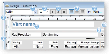 Det finns fördefinierade, variabla fält som t.ex. kundnummer som programmet själv tilldelar uppgifter vid utskriften. Man kan även själv ange text för utskrift, så kallade fritexter. Bilder och grafiska linjer är andra objekt som också finns tillgängliga.