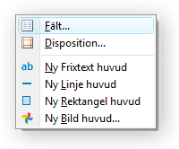 Om detta sker i någon av sektionerna sidhuvud eller sidfot ges även möjlighet att direkt skapa en ny fritext i sektionen. Grafiska objekt som linjer och rektanglar kan också väljas in genom att högerklicka arbetsytan för sidhuvud eller sidfot. Ny bild kan väljas in direkt på blanketten genom att högerklicka på arbetsytan sidhuvud eller sidfot i blankettdesignen. Bilder kan även hanteras i Dialogen Fält. |