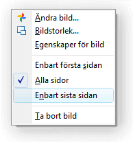 Genom att högerklicka på en befintlig bild som tidigare har lagts in i blankettens sidhuvud eller sidfot, kan man dels ändra till annan bild eller öppna dialogen Bildstorlek. Via dialogen Bildstorlek kan man bestämma upplösningen och storleken på bilden som har valts in på blanketten. Enbart första sidan skriver bilden i sidhuvud eller sidfot på enbart den första sidan av en blankett som kan består av flera sidor. Enbart sista sidan skriver bilden enbart på den sista sidan av en blankett och kan t.ex. användas för bild i sidans fot som är relaterad till texter och fält som också dessa enbart skrivs på sista sidan. |