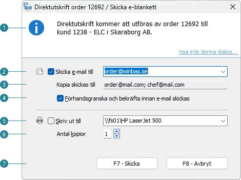 Normalt visas ingen dialog vid direktutskrift, istället sker utskriften direkt i bakgrunden när t.ex. ordern sparas - dialogen visas alltså enbart när e-blanketter aktiveras. Dialogen kan då visas vid följande direktutskrifter:
