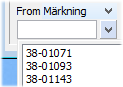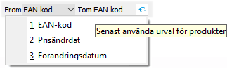 När en rubrik för alternativnummer väljs, som t.ex. EAN, OEM eller annan typ av kod eller märkning, kommer urvalet enbart att gälla produkter med nummer registrerade i intervallet för den definierade rubriken. När en rubrik har valts kan knappen vid fältet användas för att visa en lista över registrerade förekomster i positionen. |