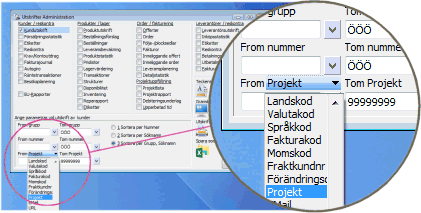 Detaljstatistik kan skrivas på valfria begrepp i kundregistret och produktregistret. Välj t.ex. Projekt för att ta fram statistik på transaktioner med ett visst projekt, eller Fakturakund för statistik på kunder med en eventuell fakturakund.