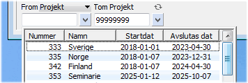 Då det är många fält i listan och de visas i logisk ordning snarare än alfabetisk ordning, kan man istället för att bläddra i listan - trycka första bokstaven tills det aktuella fältet aktiveras, t.ex. bokstaven P för Projekt.