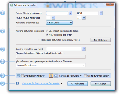 Man kan välja att fakturera endast vissa kunder. Ange Fr.o.m. / t.o.m. kundnummer. Vill man inte göra något urval på kundnummer låter man fälten vara som de är.