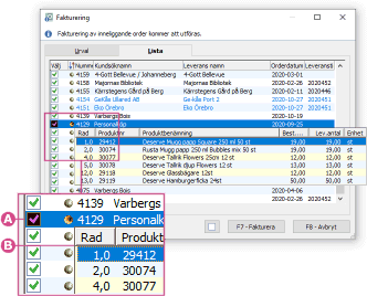 Genom att först begränsa urvalet med intervall för exempelvis kundnummer, och sedan bocka av enskilda order kan faktureringen styras med avseende på varje enskild order.