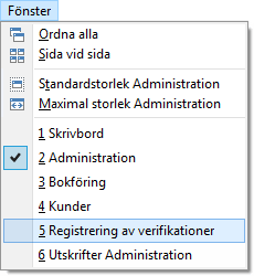 Alternativet Fönster på menyraden innehåller funktioner för fönsterhantering och visar alla rutiner som är för tillfället är öppna. Den rutin som har en markering framför sig är den som är det aktiva fönstret, d.v.s. normalt det fönster som ligger överst i Winbas.