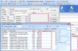I förgrunden Kassa med kolumnerna ákostnad och TG invalda. Bakom ligger Produkter med inpriser och pålägg. Längst bak i fönsterordningen skymtar Order / faktura med transaktioner där kostnaden är vald i skärmlistan. |
