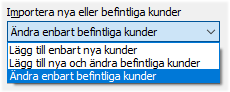 Ändra enbart befintliga kommer inte att skapa några nya poster utan enbart uppdatera de kunder, leverantörer eller produkter som finns i filen.