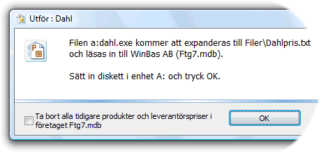 Om filen levereras på diskett och så är angivet för inläsningen, ges meddelande om att disketten ska sättas in i diskettenheten. Tryck därefter på OK för att starta inläsningen.