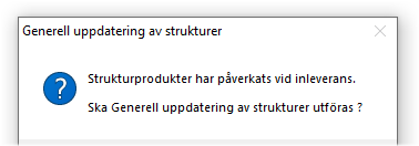 Alternativet Utför alltid generell uppdatering av strukturer visar inte frågan utan uppdatering av strukturer kommer att ske automatiskt. I normalfallet bör funktionen alltid utföras för att ha uppdaterade strukturer, men kan kopplas bort då uppdatering istället sker vid särskilda tillfällen och kanske inte just vid den enskilda inleveransen.