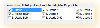 Avrundning i intervall. Om intervaller finns angivna för automatiskt beräknade utpriser, kommer dessa även att användas för nettopriset. Detta innebär att om lägsta intervall för avrundning till 1 krona är t.ex. 10, kommer heller ingen avrundning att ske om priset är under 10. Det gör det också möjligt att t.ex. lägga hela 10-kronor på högre försäljningspriser. Dessa gränsvärden kommer då också att gälla vid försäljning i utländsk valuta.