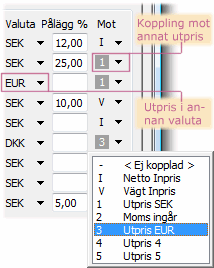 När man kopplat in prislista mot netto inpris eller annat utpris och alltså inte valt alternativet < Ej kopplad >, sker normalt uppdatering av priset baserat på kursen i valutatabellen och oavsett om påläggsfaktor för priset finns på produkten eller inte.