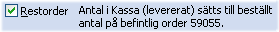 Levererat antal sätts till beställt antal är inte aktiverad vilket istället innebär att rest.antal (Antal - Kassa) kommer att sättas till antal och antal i kassa nollställs på raderna. |