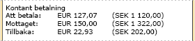 Detaljerad information visas i kvittots betalningsdel i de fall man tar betalt i utländsk valuta såsom t.ex. euro. Normalt visas mottaget belopp och belopp tillbaka vid kontant betalning i systemvalutan (SEK).