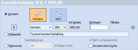 Kassaordern kan även faktureras direkt om den inte ska betalas, samfaktureras eller faktureras i efterhand tillsammans med andra inneliggande kundorder via rutinen fakturering. En faktura kommer då att skapas med det betalningsvillkor som har angivits i dialogen.