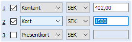 Betalningen kan delas upp på tre olika betalningssätt och genom att ange ett belopp på annat betalningssätt som återfinns på andra raden, kommer detta belopp att dras från första betalningen.