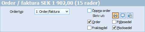 Om istället ordern ska öppnas, kommer föreslagna och eventuellt förändrade utskriftsalternativ att föreslås i Order / faktura. Utskriften sker sedan från Order / faktura efter att eventuella kompletteringar har gjorts på ordern. |