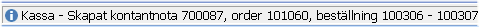När betalning och eventuella order och beställningar har skapats återgår kassan till registrering av ny kassaorder. I statusraden visas senaste kvittonumret / kontantnota samt order och beställningar som eventuellt har skapats samtidigt.