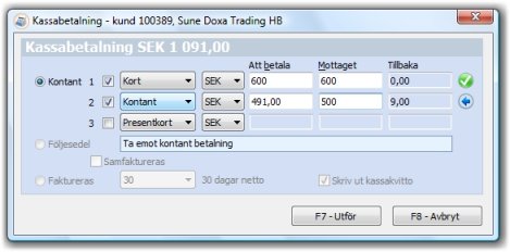 F7 - Utför. Efter angivet betalningssätt och mottaget belopp trycks F7 - Utför för att effektuera betalningen av angivna fakturor. |