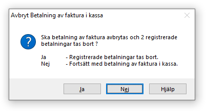 F8 - Avbryt. Om betalningen av någon anledning behöver avbrytas kan man antingen välja att nollställa registrerade fakturor för betalning, eller ändra i den tidigare registreringen.