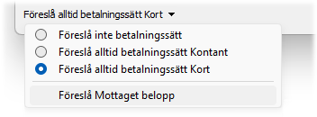 I den avancerade vyn väljs betalningssätt Kort i listan med betalningssätt. Kassaoperatören kan då välja alternativet Kort i det första aktiverade betalningssättet genom att fälla ner rullningslisten. Man kan även aktivera det andra betalningssättet där kort alltid är förvalt (Alt+2 eller klick på krysset). |