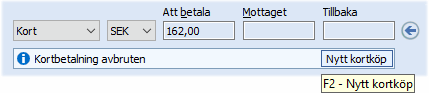 Nytt kortköp. Efter avbruten betalning visas knappen Nytt kortköp för att starta om köpet eller växla till ett annat betalningssätt. Knapparna med funktionerna är också tillgängliga med funktionstangenten F2.