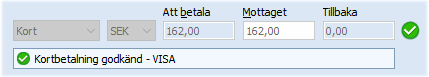När transaktionen har godkänts från servern kommer mottaget belopp att fyllas på automatiskt i dialogen. Tangenten Enter eller knappen F7 - utför trycks för att avsluta betalningsdialogen och skriva ut kvittot. |