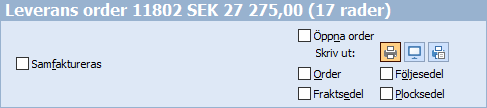 När transaktionerna i den befintliga kundordern är bearbetade kan knappen F7 - Leverans väljas för att öppna, eventuellt märka för samfakturering - eller skriva ut orderbaserade blanketter. |