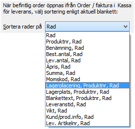 Raderna ligger då alltså i samma ordning som underlaget man t.ex. plockat efter i en lagersituation. Inställningen för sorteringen på skärmen i görs då i inställningar för order, där samma alternativ som kan anges för t.ex. följesedel, plocksedel eller fraktsedel då kan väljas även för skärmen i kassa vid leverans. |