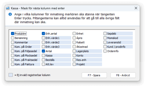 Kolumner som är registrerbara, men som för tillfället inte är invalda i skärmlistan visas med skuggad bakgrund. Dessa kolumner kan ändå väljas, men kommer inte att aktiveras för inmatning förrän de har valts in i skärmlistan. För ytterligare information om vilka kolumner som kan väljas in i Kassa se avsnittet Kolumner och fält.
