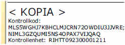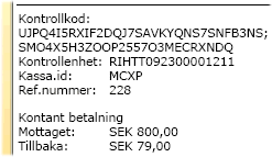 Kontrollkod Kontrollenheten kommer att skapa en kontrollkod som skrivs ut på kvittot bestående av två delar. Först en signeringskod på 32 tecken och därefter en krypteringskod på 26 tecken, avgränsade med tecknet semikolon (;). Kontrollenhetens identitet skrivs därefter också ut på kvittot tillsammans med kassans identitet och kassans unika referensnummer. |