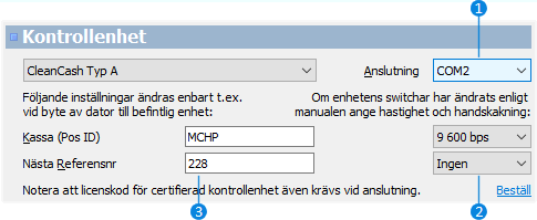 Undantaget är kontrollenheten som måste vara en CleanCash Typ A. Den levereras tillsammans med en aktiveringskod från Winbas AB och vi lämnar enbart ut aktiveringskoder till kunder som beställt kontrollenheten av Winbas AB. Det betyder att enbart kontrollenheter från Winbas AB tillåts i våra system.