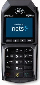 Winbas stöder integration med den nätbaserade tjänsten Nets Connect@Cloud. Det innebär att terminalen Ingenico Lane/3000 kommunicerar direkt mot servern över Internet. På samma sätt anropar också kassan tjänsten för att styra terminalen, som också svarar med uppgifter om köpet som t.ex. skrivs ut på kassakvittot. Utöver strömadaptern, görs en koppling till terminalen med en nätverkskabel. Inget annat kablage krävs mot själva kassadatorn. Server. Vid skarp drift av kortbetalning ska servern märkt (Aktiverad) väljas i listan. Den andra serveradressen används vid tester. Användare och Lösenord. Ange det användarnamn och lösen som har tilldelats i samband med beställning av tjänsten. En och samma användare kan ha flera olika kassor och betalningsterminaler. Ingenico Lane/3000 |
