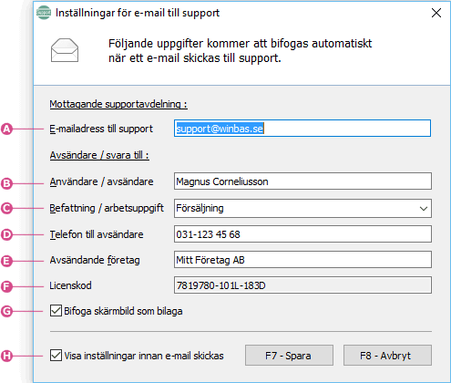 Inställningar för e-mail till support innebär att man kan registrera återkommande uppgifter såsom direkttelefon för att supportavdelningen snabbt ska kunna återkomma med svar. Första gången e-mail ska skickas till support öppnas dialogen för att ange uppgifter om t.ex. avsändare och telefonnummer.