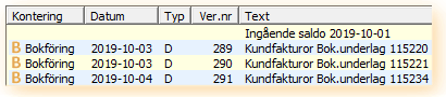 Skärmlistan innehåller normalt max ett par hundra konteringar, beroende på antal transaktioner på det aktuella kontot. Tidigare transaktioner visas som ingående saldo för perioden, antal transaktioner kan därför variera beroende på var man befinner sig i perioden. Om kontot har mindre antal transaktioner, är ingående saldo räkenskapsårets början. Om kontot har ett större antal transaktioner, är ingående saldo innevarande periods början. |