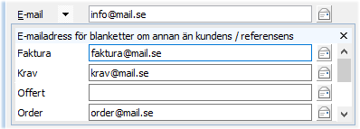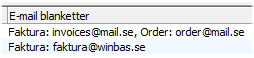 Import av E-mailadresser. Om fältet EMailBlank importeras till kundregistret kan en eller flera adresser för olika blanketter specificeras tillsammans med kundnummer i filen. Formatet för de olika blanketterna kan då vara samma som de i söklistan t.ex. Faktura: namn@mail.se, med kolon (:) efter blankettens namn, styrkoden för blanketten.