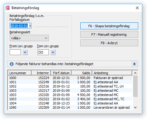 När betalningsförslag skapas automatiskt till betalningsförslaget, kommer fakturor som är attesterade (om attest användes) att ligga till grund för de betalningar som kan göras. Fakturor som inte är attesterade kommer inte att behandlas i betalningsförslaget. Ej heller kommer fakturor som är spärrade, eller fakturor från leverantörer som är spärrade att behandlas.