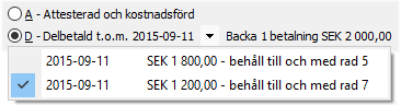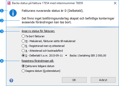 Om fakturan är fullbetald kommer dialogen att föreslå den senaste delbetalningen. Om fakturan är delbetald ges förslag om att status backas fram t.o.m. den näst sista delbetalningen, och enbart sista delbetalningen kommer då att tas bort. Vid behov av att backa fakturan fram t.o.m. en tidigare delbetalning, kan delbetalningen väljas i menyn där betalningsdatum och betalt belopp visas. Den betalning som väljs i listan kommer att bli den sista betalningen när funktionen har utförts.