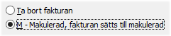 Det är också möjligt att makulera en faktura som inte är journalförd och alltså inte gått vidare till bokföringen. Fakturan kommer då att sättas till M - Makulerad på samma sätt som om den ingick i ett bokföringsunderlag. Använd makulering av ej bokförd faktura för spårbarhet och därmed också undvika luckor i serien för fakturornas internnummer vid borttagning.