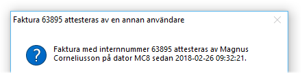 Om flera signaturer används för attestering kommer en varning att visas i när en annan av användarna håller på med attestering av samma faktura. Varningen visas då för övriga användare som väljer fakturan när den som attestera registrerar sin kontering, kanske också med pågående uppdelning av eventuella delbelopp på olika kostnadskonton.