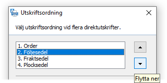 Vid flera direktutskrifter är det möjligt att ändra i vilken ordning de olika blanketterna skrivs ut. Alternativet Utskriftsordning visar dialogen för att ändra utskriftsordningen vid flera samtidiga direktutskrifter.