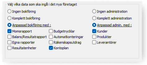 Alla inställningar under menyn Arkiv, grundregister i administration och bokföring samt alla utskrifter kopieras alltid från det befintliga företaget till det nya oavsett vilka alternativ som väljs.